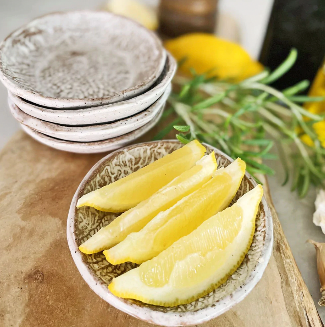 A shallow ramekin to hold all the little things from citrus wedges to chutneys and aoilis. Organic edged, hand built bowls impressed with natural coral and seafan. Dark brown stoneware with a sea salt glaze finish. Perfectly imperfect. Dishwasher safe and microwave safe however we recommend handwashing your original work of art. Measures approximately 3.5".