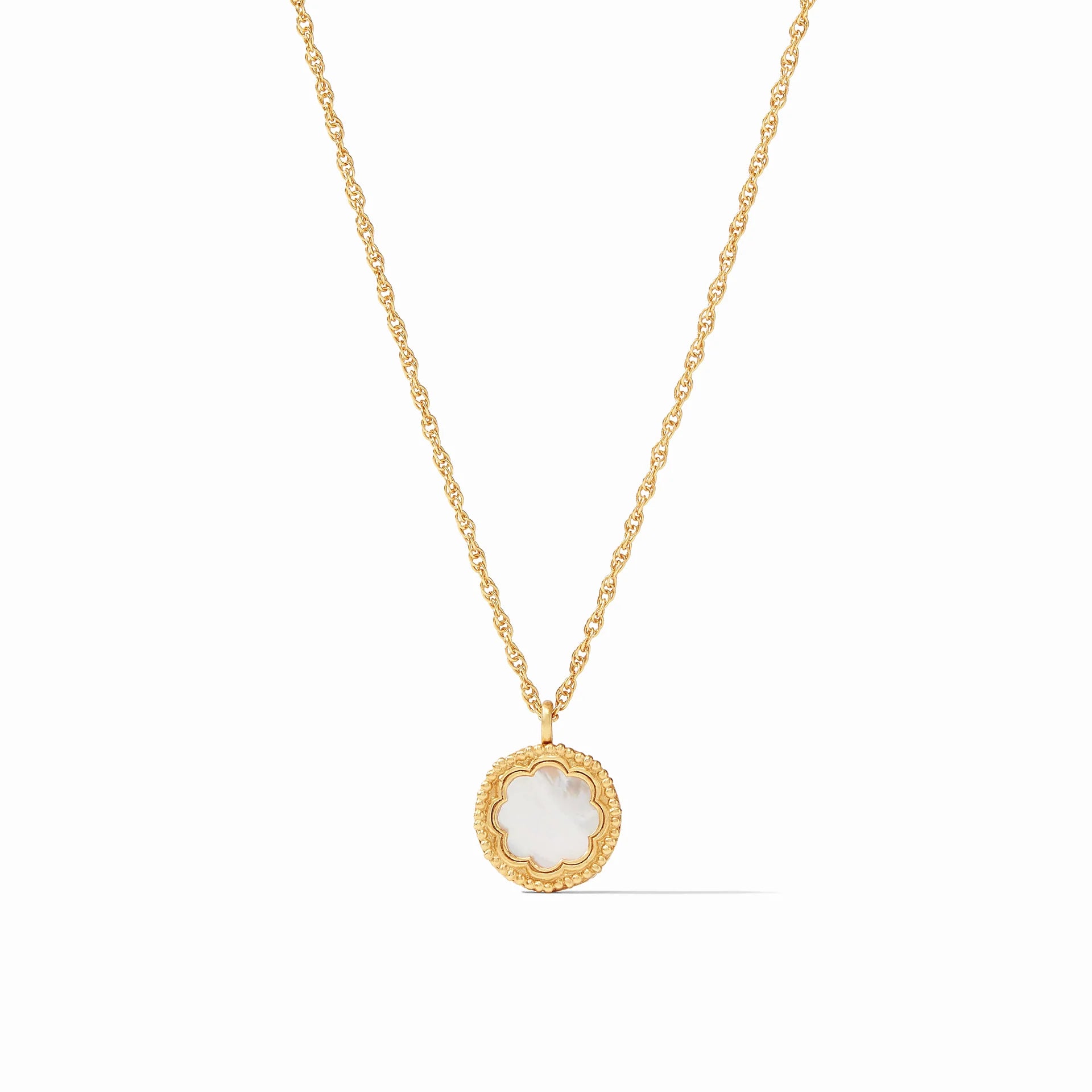 A delicate, adjustable curb chain is accented by a small, intricately embellished coin pendant, featuring a beaded border, fleur-de-lis, scallop motif, and unicorn—all inspired by the history of Italy’s internationally-influenced city of Trieste.